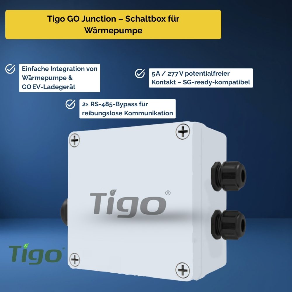 Passend für ein‑ und dreiphasige EI Wechselrichter, alle Tigo GO EV‑Charger sowie Wärmepumpen mit Dry‑Contact‑Eingang. Mehrere Junctions lassen sich pro Anlage parallel betreiben.