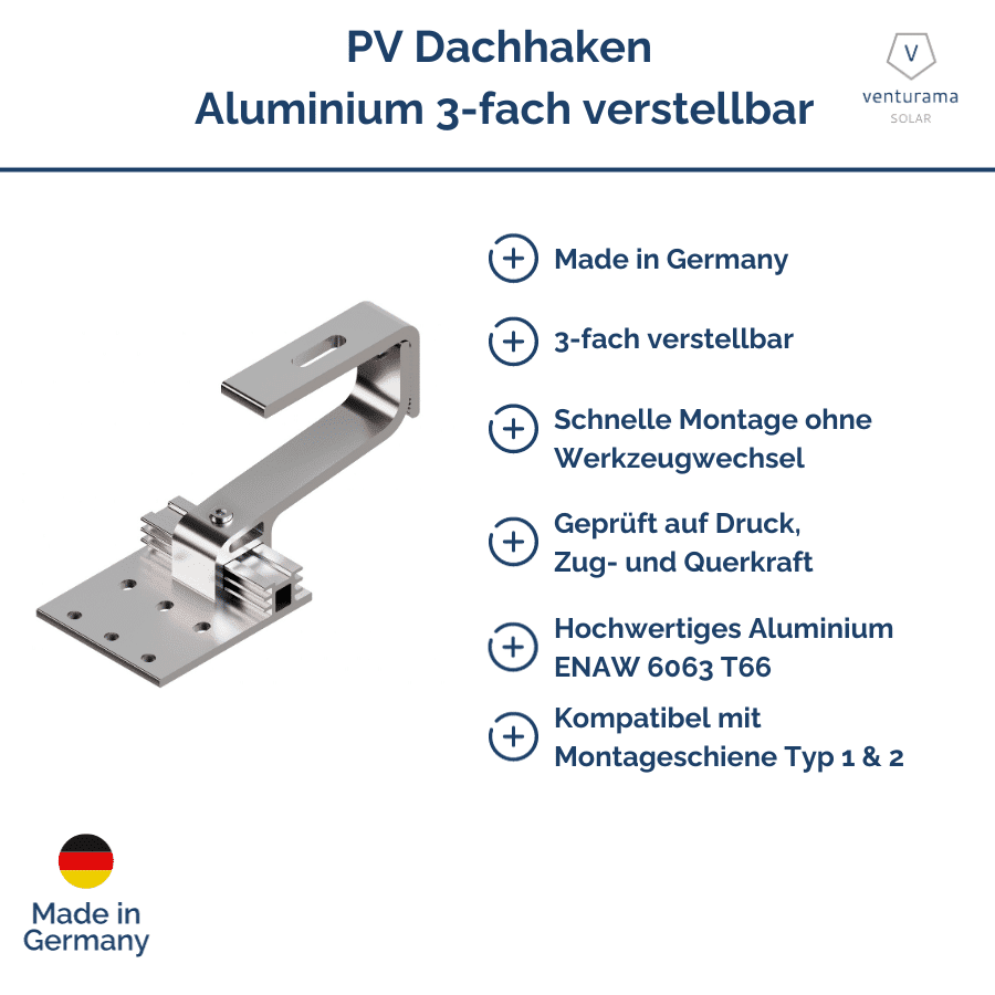 Dank der hochwertigen Verarbeitung und des witterungsbeständigen erstklassigen Materials überzeugt der PV Dachhaken durch maximale Belastungswerte, hinsichtlich Zug-, Druck- und Querkräften, und das ganz ohne sich auf den darunter liegenden Dachziegeln abzustützen und eine Beschädigung dieser zu riskieren. Durch die Verwendung hochwertigen Aluminiums ist der Dachhaken der Standard Line besonders leicht und für den Mittellastbereich geeignet. Mit dem Solar Dachhaken sichern Sie sich eine besonders langlebige und zuverlässige Installation Ihrer PV Anlage.
