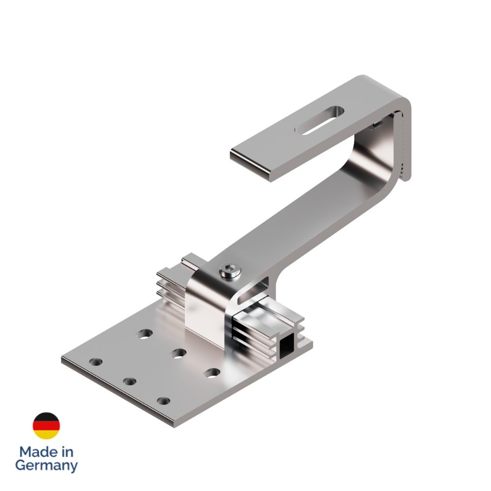 Der 3-fach verstellbare Dachhaken für Solarmodule lässt sich mit nur einem einzigen Werkzeug befestigen, ausrichten und justieren. Zur Befestigung des Dachhakens auf dem Sparren empfehlen wir jeweils zwei Tellerkopfschrauben M8 x 100, oder bei Konterlattung entsprechend längere Schrauben. Er lässt sich flexibel auf verschiedensten Ziegeldächern ab einer Dachneigung von 20° zur Installation der PV Montageschiene einsetzen. Im Gegensatz zu herkömmlichen Dachhaken ermöglicht der PV Haken eine deutlich effizientere und zeitsparende Montage Ihres PV Systems.