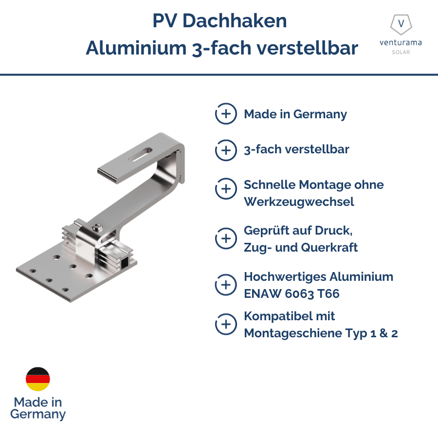 Dank der hochwertigen Verarbeitung und des witterungsbeständigen erstklassigen Materials überzeugt der PV Dachhaken durch maximale Belastungswerte, hinsichtlich Zug-, Druck- und Querkräften, und das ganz ohne sich auf den darunter liegenden Dachziegeln abzustützen und eine Beschädigung dieser zu riskieren. Durch die Verwendung hochwertigen Aluminiums ist der Dachhaken der Standard Line besonders leicht und für den Mittellastbereich geeignet. Mit dem Solar Dachhaken sichern Sie sich eine besonders langlebige und zuverlässige Installation Ihrer PV Anlage.