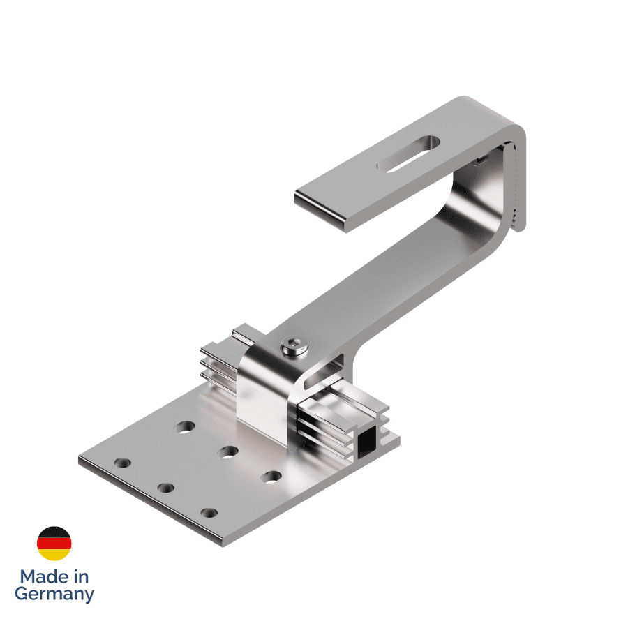 Der 3-fach verstellbare Dachhaken für Solarmodule lässt sich mit nur einem einzigen Werkzeug befestigen, ausrichten und justieren. Zur Befestigung des Dachhakens auf dem Sparren empfehlen wir jeweils zwei Tellerkopfschrauben M8x 100, oder bei Konterlattung entsprechend längere Schrauben. Er lässt sich flexibel auf verschiedensten Ziegeldächern ab einer Dachneigung von 20° zur Installation der PV Montageschiene einsetzen. Im Gegensatz zu herkömmlichen Dachhaken ermöglicht der PV Haken eine deutlich effizientere und zeitsparende Montage Ihres PV Systems.