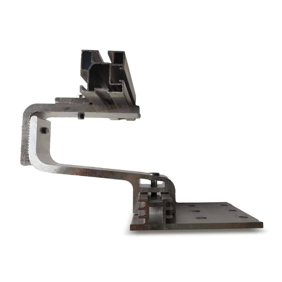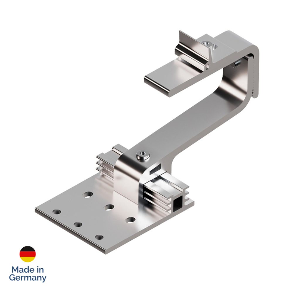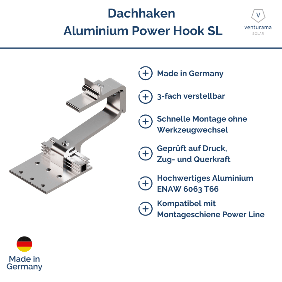 Der V8 Power Hook SL 160 mm ist mit einer dreifachen Verstellmöglichkeit und einer Steglänge von 160 mm ausgestattet. Der leichte PV Dachhaken lässt sich im Dachlattenbereich horizontal stufenlos verschieben, kann kraftschlüssig auf seiner Grundplatte in drei unterschiedlichen Höhen befestigt werden und ermöglicht es, die Befestigung des oberen Winkels individuell, form- und kraftschlüssig, über die Riffelung am Bügel und die vormontierte Sechskantschraube, einzustellen. Der Alu Dachhaken für Photovoltaik ist dank maximaler Belastungswerte die perfekte Lösung für eine flexible, fein justierte und zuverlässige Montage Ihrer PV Unterkonstruktion.